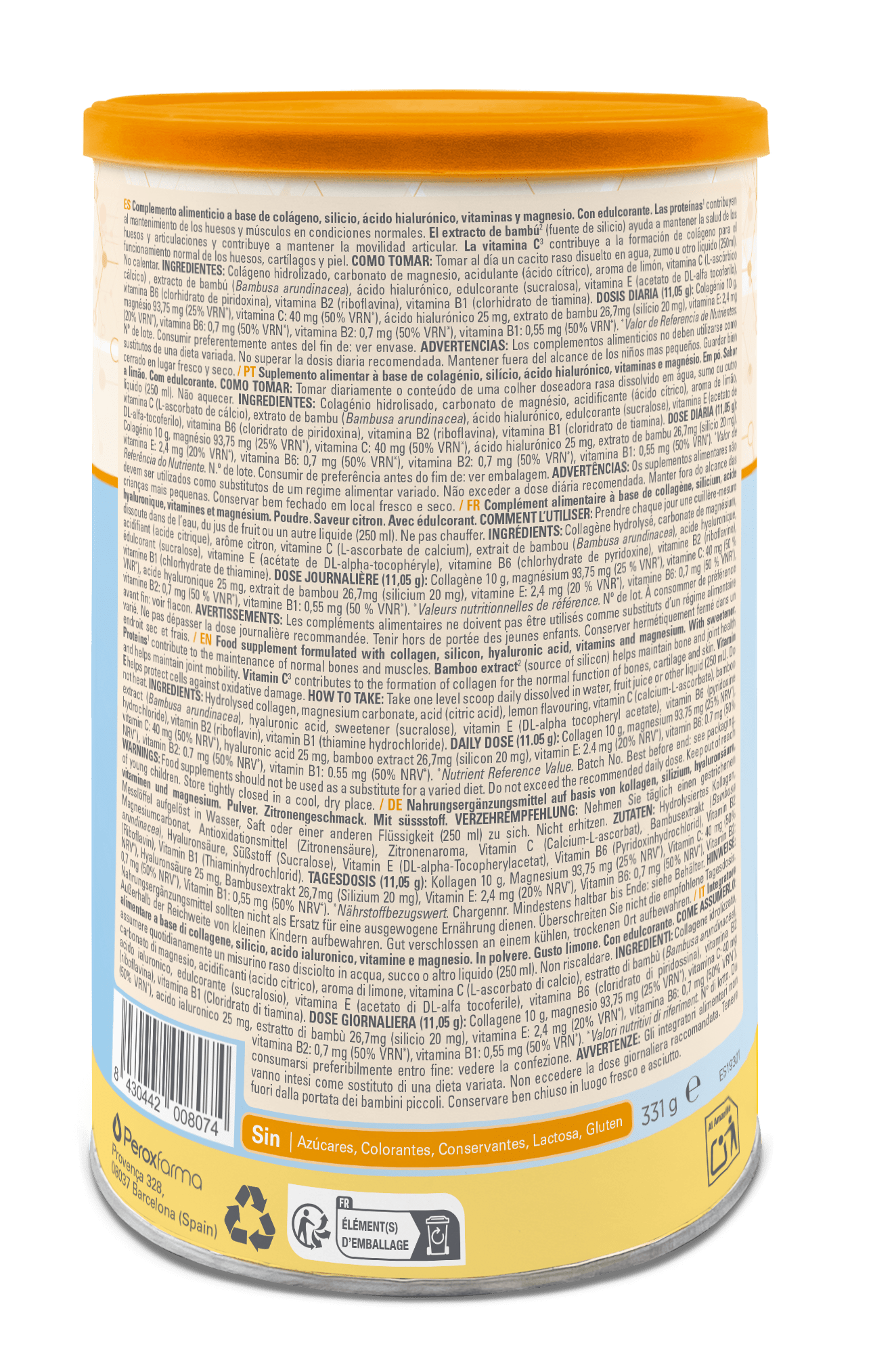 Nutritional supplement with bioassimilable hydrolyzed collagen, silicon, hyaluronic acid, magnesium and vitamins B1, B2, B6 and C. Contributes to the functioning of bones and muscles in normal conditions, to the production of collagen and to the reduction of tiredness and fatigue.